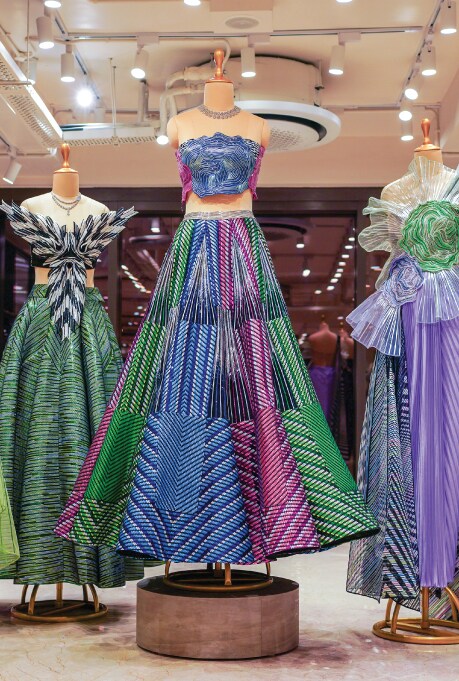 The highest level of the store is quite literally a cherry on the top with an ambient bridal studio. Comprising private salons complete with plush furnishings and trial rooms, this floor is designed to offer a highly personalised and integrated bridal shopping experience. The journey is further enhanced with the help of qualified in-house stylists who make wedding shopping feel like a breeze. While each piece is adorned with age-old craftsmanship, the silhouettes include both traditional and contemporary options, thoughtfully curated for modern brides and their unique sensibilities.