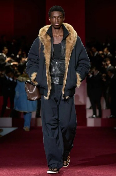 Tuxedos were reimagined, cinched with cummerbunds and embellished with crystal brooches and jewelled buttons, but the collection was not confined to classic eveningwear. Instead, it oscillated between old-school Hollywood and early-2000s nostalgia. Think faux-fur jackets, slouchy denim, cargo pants, baker-boy caps, and flashes of leopard print and sequins. The result was a contemporary vision of the leading man – confident, slightly excessive, and unmistakably Dolce & Gabbana.