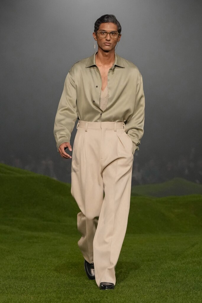 Fluid silhouettes moved effortlessly between tailoring and leisure, borrowing from the relaxed language of pyjamas and sweatpants, yet executed with unmistakable refinement. Blazers and trousers featured utilitarian pockets – a luxurious reinterpretation of cargo dressing – while fabrics remained soft, weightless, and wearable. What stood out most, however, was the singularity of Armani’s vision. This collection felt less archival and more conversational – subtly tuned to a younger generation.