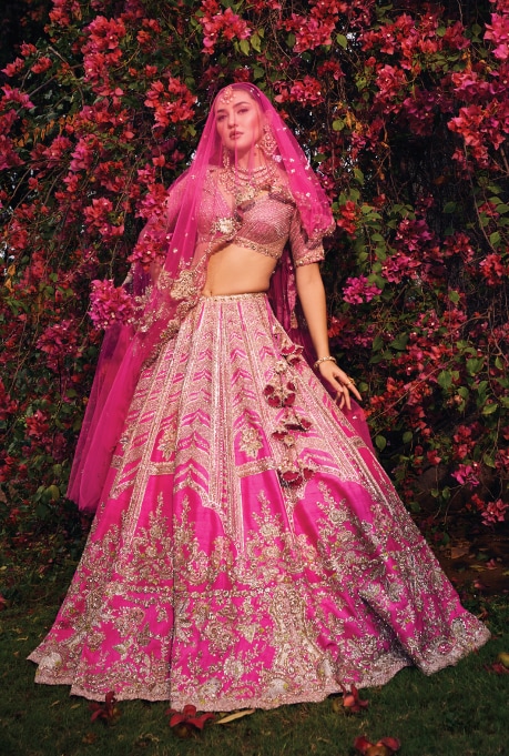 Red-the bold hue synonymous with Indian weddings is always the perfect choice. To complement a modern ensemble, go for a muted look that comprises soft shimmery eye shadow and a peach tone for the cheeks and lips. But when it comes to your hair, go global with a shade of burgundy that complements your skin tone and watch the look come alive.
