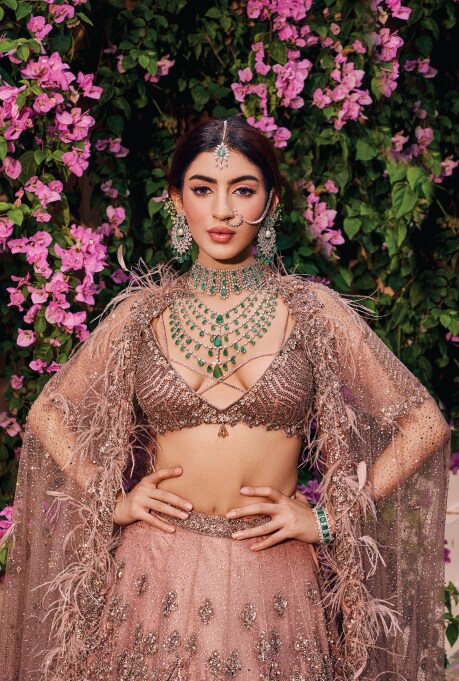 Unlock the true potential of your lehenga adorned with exquisite metallic accents. Select shades that perfectly complement the attire; opt for a subdued eyeshadow with a slight blush, and complete your look with deeper lipstick and a hint of gloss.