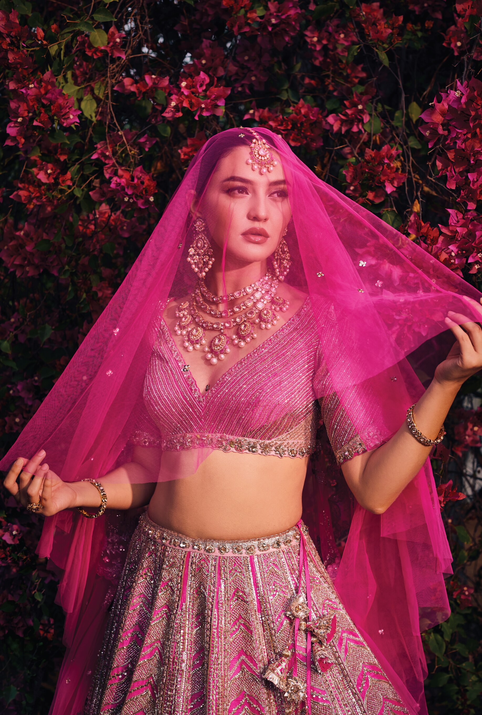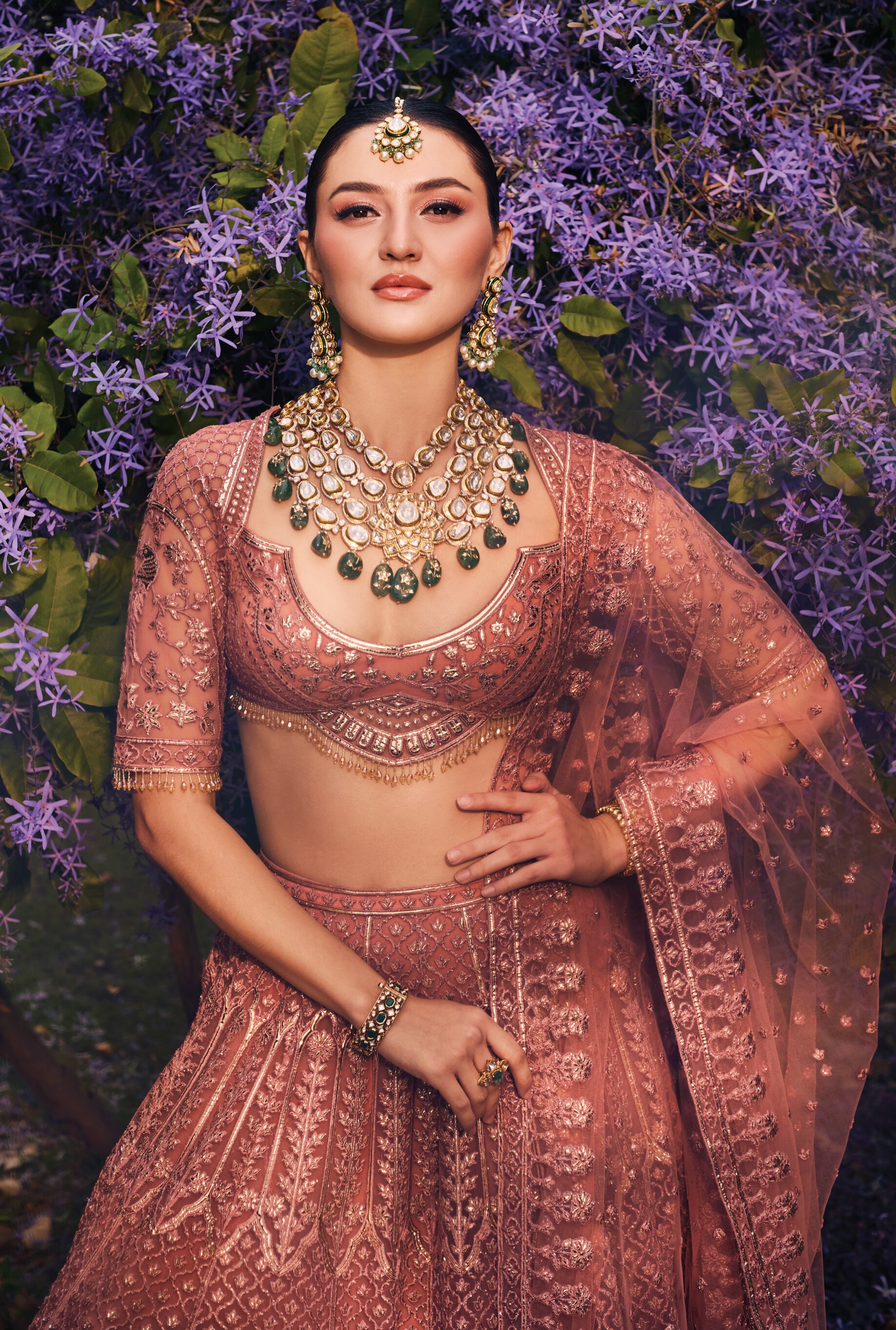 Unlock the true potential of your lehenga adorned with exquisite metallic accents. Select shades that perfectly complement the attire; opt for a subdued eyeshadow with a slight blush, and complete your look with deeper lipstick and a hint of gloss.