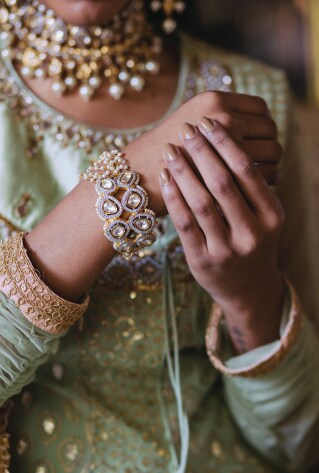 Headpieces are an important part of your bridal repertoire to complete the look. Invest in a dainty polki maang tikka for pre-wedding affairs and a statement piece for grand galas like sangeet night or reception soiree while a beautiful matha patti piece can be reserved for the big day.