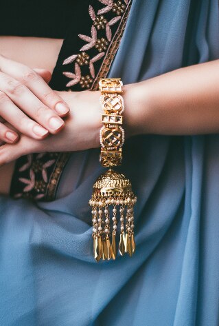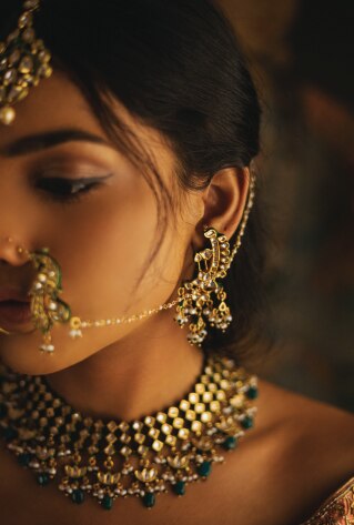 Headpieces are an important part of your bridal repertoire to complete the look. Invest in a dainty polki maang tikka for pre-wedding affairs and a statement piece for grand galas like sangeet night or reception soiree while a beautiful matha patti piece can be reserved for the big day.