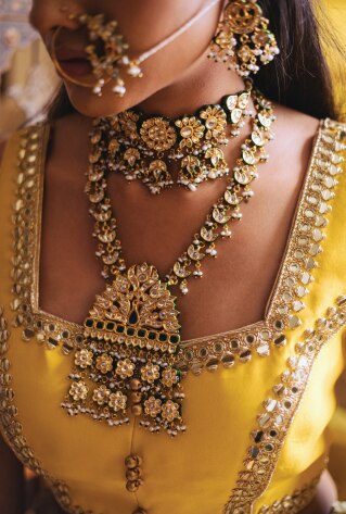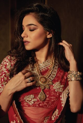 A meticulously-curated bridal trousseau must hold at least one heritage-worthy jewellery set; something that exudes royalty at every glance. A beautiful set jewelled with emerald or rubies makes for a perfect pick to accentuate your bridal glow. Style your cocktail look and reception appearance enriched with imperial nuances to channel a princess-like vibe.