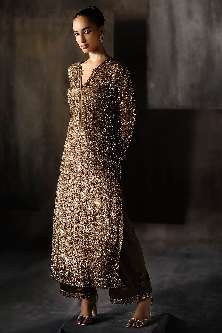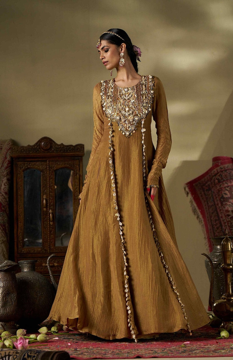 Dhanteras is all about celebrating prosperity and auspicious new beginnings – think of golds, champagne tones, and soft metallics that capture the festive glow. Embrace the spirit of Dhanteras with an ensemble that gleams in gold tones, delicate shimmer, and rich zari accents – a look that radiates festive opulence.