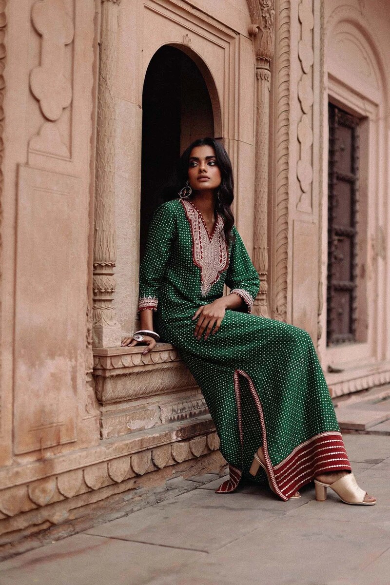 Celebrate the triumph of good over evil this Chhoti Diwali in the season’s most powerful hue – red. From rich ruby and deep maroon to fiery crimson, these shades exude warmth and festive energy. Opt for an embellished anarkali or a chic sharara set for the perfect blend of tradition and modernity. Finish the look with gold-toned danglers or kundan earrings and soft curls, letting the striking colour take centre stage.