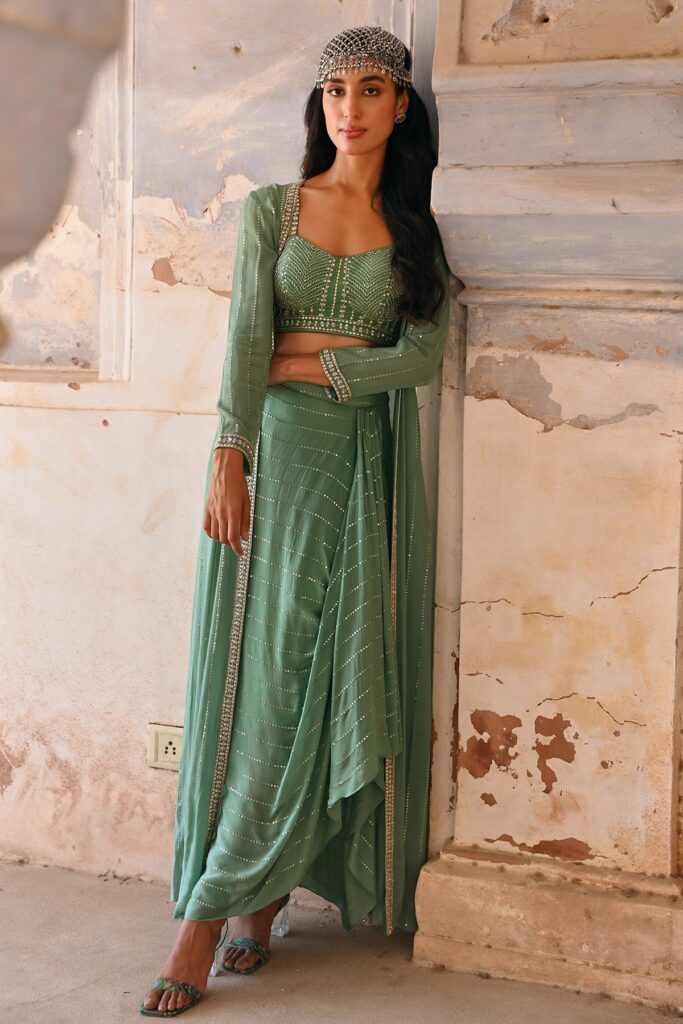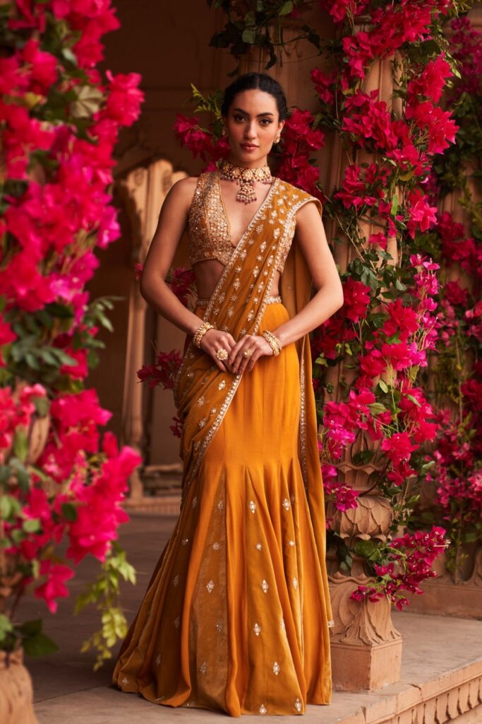 Dhanteras is all about celebrating prosperity and auspicious new beginnings – think of golds, champagne tones, and soft metallics that capture the festive glow. Embrace the spirit of Dhanteras with an ensemble that gleams in gold tones, delicate shimmer, and rich zari accents – a look that radiates festive opulence.