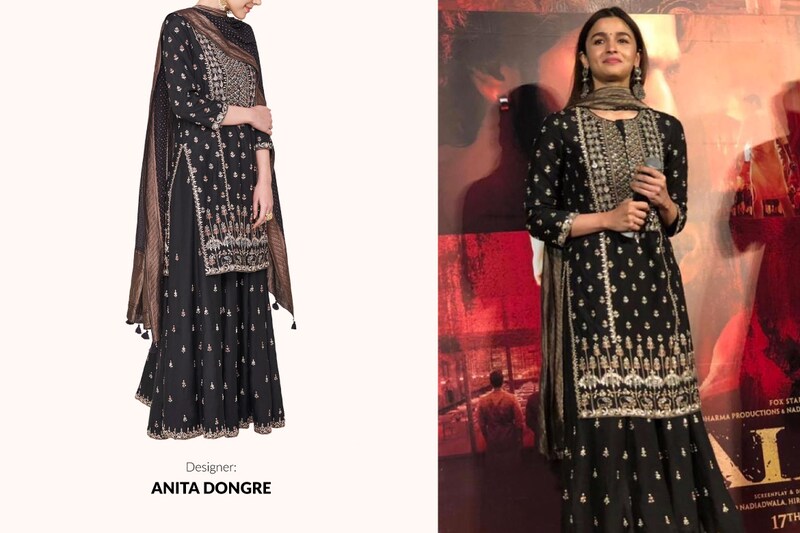 Alia’s look in this black sharara ensemble Anita Dongre speaks volumes of regal allure. Painstakingly embroidered with motifs that depict the majestic forests of Rajasthan, this look will let your impeccable appeal take centre stage at the Iftaar party.
