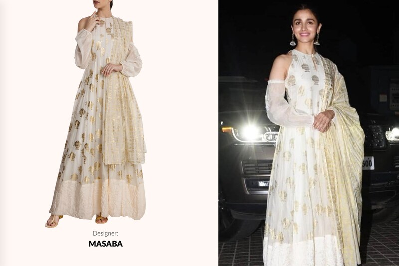 Alia is a perfect Masaba muse. Her glowing look in this white and gold cold-shoulder Anarkali by Masaba redefines new-age classic. The ensemble is a perfect substitute to heavy anarkalis and a trendy head-turner for lunch feast on Eid.