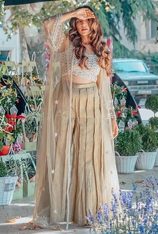 If dancing at weddings is in the plan of action for you, reserve a couple of breezy shararas to steal the limelight. Bring your A-game to the dance floor as you twirl effortlessly in this charming printed sharara ensemble by Mayeera Jaipur