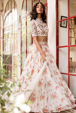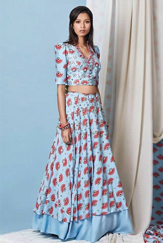 Matching micro prints were a huge rage this summer. Stay on track of the quirky dictum pairing florals with florals or even mismatching them with geometrics for the perfect dose of fun. Clubbing artsy motifs in a chic pair of crop top and lehenga, this piece by Riraan is perfect for sunlit mehendi ceremonies