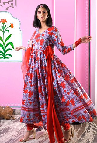 If dancing at weddings is in the plan of action for you, reserve a couple of breezy shararas to steal the limelight. Bring your A-game to the dance floor as you twirl effortlessly in this charming printed sharara ensemble by Mayeera Jaipur