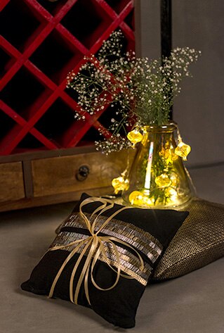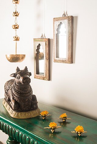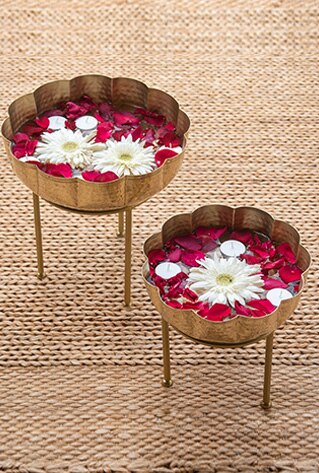 If you’re an immaculate aesthete, decorating the temple would be your favourite part of the festivities. Place antique plated hand-carved figurines of deities teamed with beautifully aligned diyas to imbibe divinity. Station a couple of gold plated Urlis with floating tea-lights and flower petals for a pleasing essence.