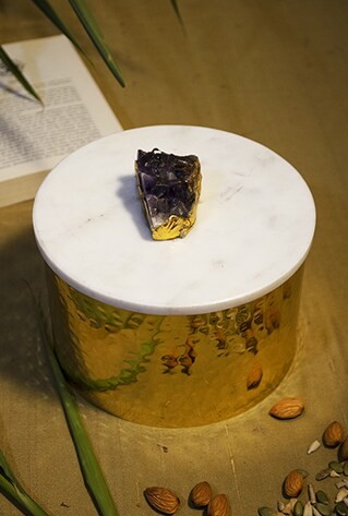 Amethyst crystals are very beautiful too. The demand for the stone is such that designers are now trying to display large chunks of amethyst as art installations. These alluring crystals purify and de-stress the aura of your home as well as ward off negativity. Soldiers were given alcohol in amethyst cups in the olden days. This was because they believed that the stone would wear off drunkenness whilst still providing them with warmth. Not only does the stone have some pretty striking properties, but the look and feel of it will add the perfect aesthetic to your living space. This gold metal box with an amethyst marble lid is one such example.