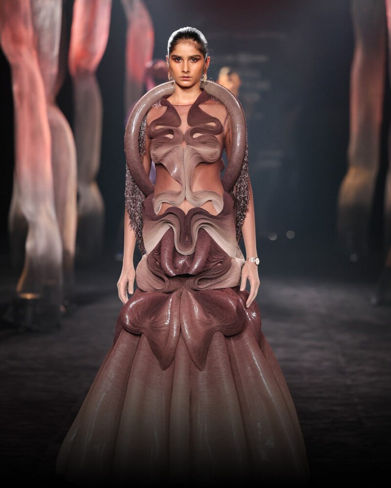 Delving into the microcosmic, the collection celebrated the intricate architecture of molecules, translating their silent brilliance into sculptural silhouettes. The narrative is anchored in DNA – nature’s outline that governs our traits, charts our path, and archives ancestral memory. Centred around five thought-provoking chapters – Origin, Bloom, Pulse, Mutation, and Memory – the show captured the rhythm of life itself. It was a breathtaking union of couture, science, and philosophy, with each ensemble echoing nature’s most exquisite blueprints. Rooted in the language of biology – from cellular division to the evolution of organisms and the unseen energy coursing beneath the skin – each piece resembled a sentient form, alive with movement and meaning.