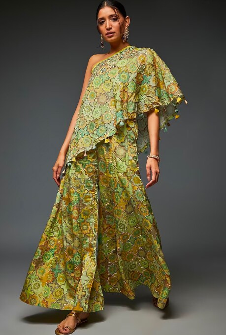 At the heart of Gopi Vaid, a much sought-after label, beats the rhythm of creative flair and artistic expression of its designer duo. Their exquisite occasion wear harmonises rich hues, understated patterns, and intricate embroidery, resulting in effortlessly chic designs that possess timeless allure. The label brings forth innovative combinations like peplum tops paired with dhoti skirts, ruffled sarees complemented with embroidered blouses and collared jackets with high-waisted pants. With a wide array of fashion-forward options, Gopi Vaid empowers fashion enthusiasts to accessorise and personalise their looks for any occasion.