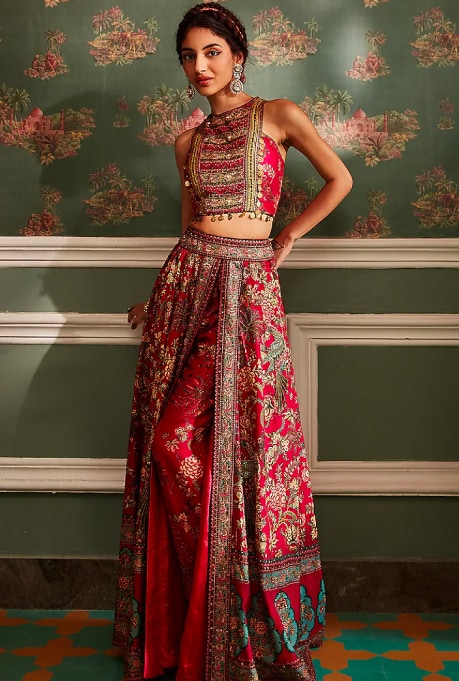 The brilliant designer Payal Singhal’s world reflects a global boho-chic aesthetic while maintaining a deep-rooted connection to Indian heritage. Picture yourself in tube kurtas paired with shararas, high-low kaftans, jogger pants, and dhoti sarees that embrace a chic and playful aesthetic. Her vibrant occasion wear breathes new life into tradition, infusing fringes, stylish hems, distinctive slits, and asymmetrical cuts that cater to the tastes of the millennial brides-to-be and bridesmaids.