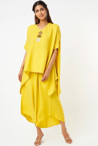 Striking neon hand block prints are placed cleverly highlighting the simple oversize silhouettes into statement pieces in Yavi‘s khadi collection. The off-beat shapes encourage the wearer to invent an individualistic style. A failsafe approach to find a leeway from conventional dress codes, perhaps at work.