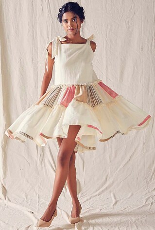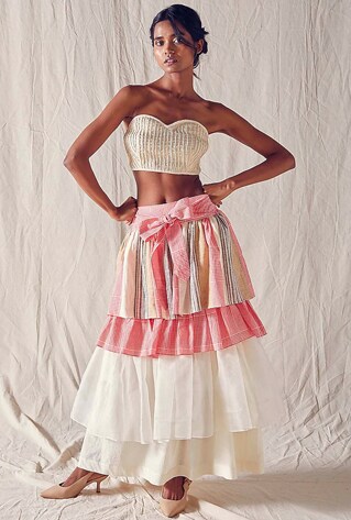 Ek Katha represents khadi with this dynamism of flirtiness and summer romance. The fabric is cut into layered and flouncy skirts and everything from form-fitting bustiers to boxy bodices. A mix of old-school and bohemian moods imbued with free-spirited moments and small pleasures of ruffles and bows.