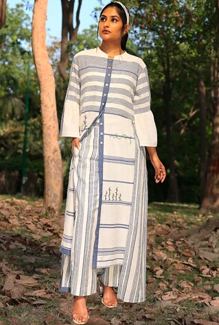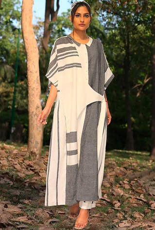 The lineup of elevated basics by Amita Gupta Sustainable features indulgently comfortable tunics sets. The breezy silhouettes offer effortless style for long summer days as well balmy evenings that extend into rooftop cocktails. The hand jamdani motifs and stripes reflect the spirit of laidback getaways.