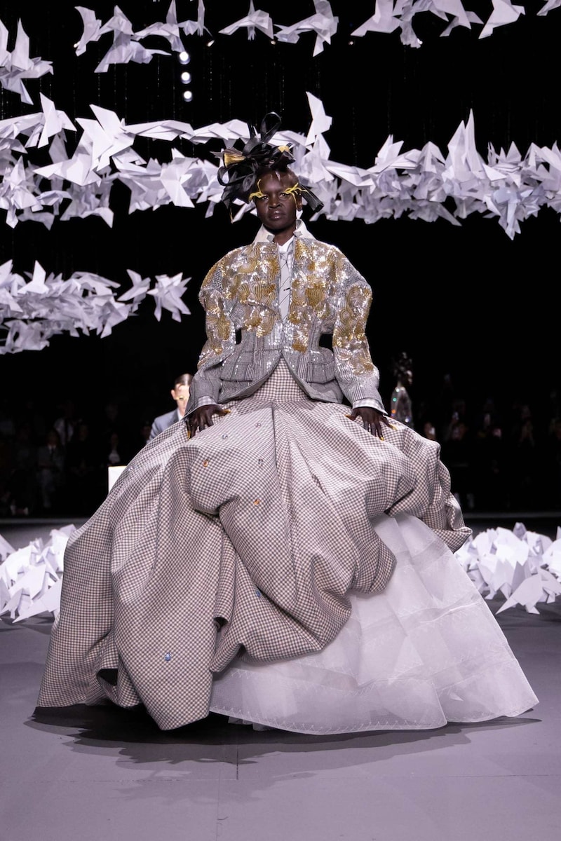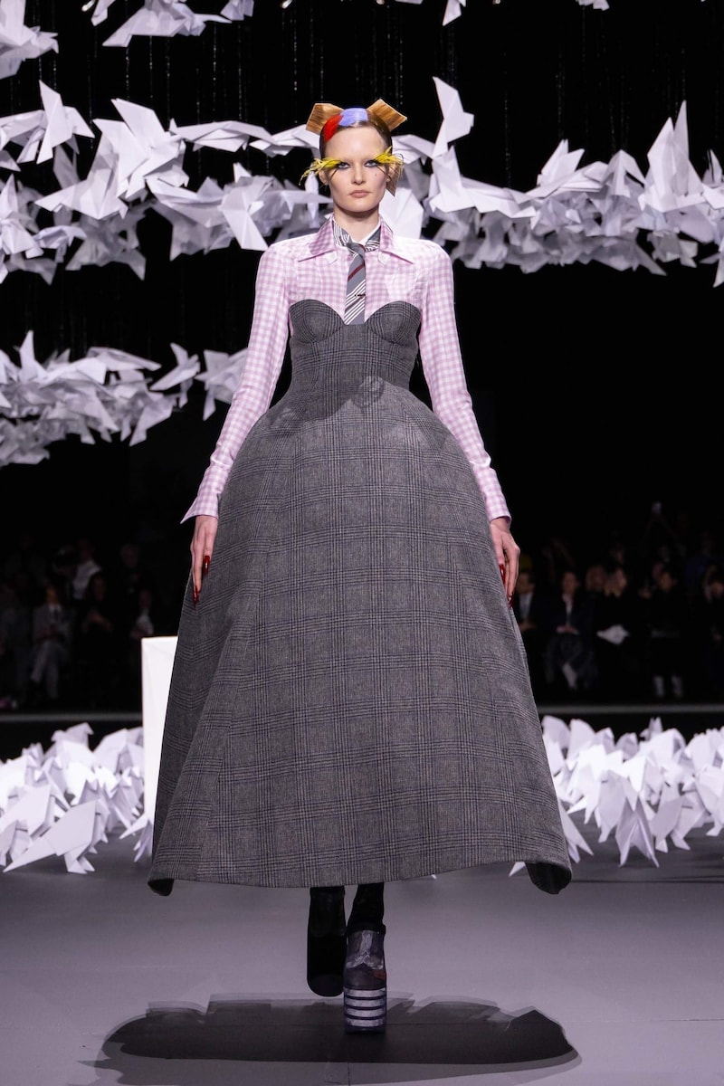 Thom Browne presented an avian-inspired collection for Fall 2025 that blended classic tailoring with surreal storytelling. The runway transformed into a dreamscape of floating origami birds, reflecting the beauty of birdwatching. The brand showcased its suiting expertise with reworked blazers – some oversized and others sharply tailored – layered over pleated skirts and elongated shorts.