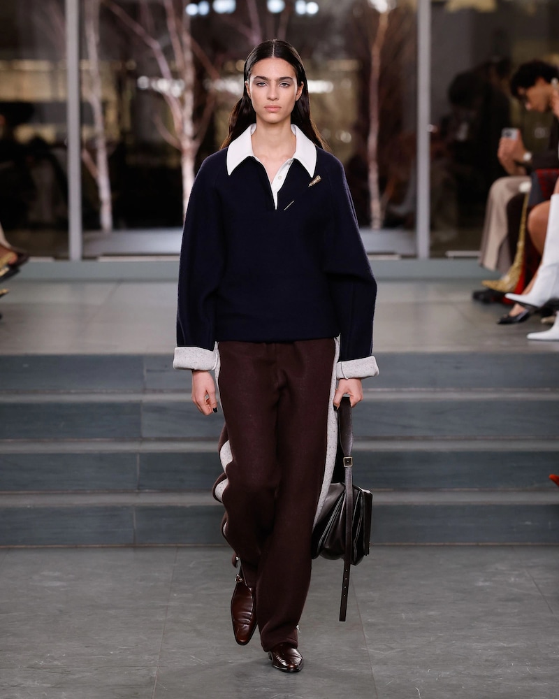 Tory Burch’s Fall 2025 collection showcased her remarkable ability to reinvent heritage fashion with a fresh take on American sportswear. Hosted at the Museum of Modern Art, the collection balanced structured and fluid designs, featuring layered cardigan twin sets, oversized striped shirts, and tailored wool jackets with exaggerated silhouettes. Accessories boasted statement cuffs and chain-linked rings inspired by vintage designs. Burch’s collection confirmed that classic American style was constantly evolving, remaining sophisticated and modern