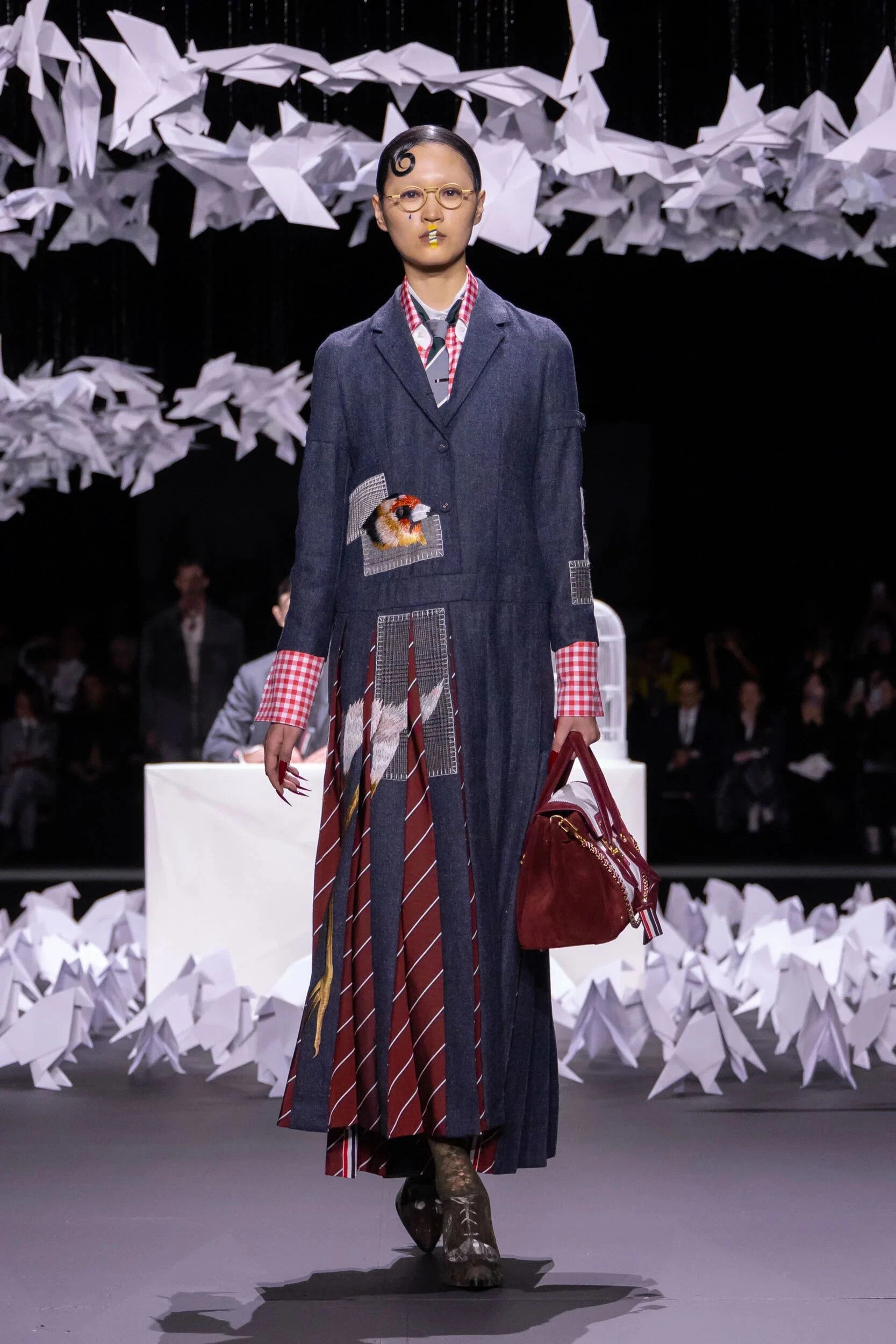 Thom Browne presented an avian-inspired collection for Fall 2025 that blended classic tailoring with surreal storytelling. The runway transformed into a dreamscape of floating origami birds, reflecting the beauty of birdwatching. The brand showcased its suiting expertise with reworked blazers – some oversized and others sharply tailored – layered over pleated skirts and elongated shorts.
