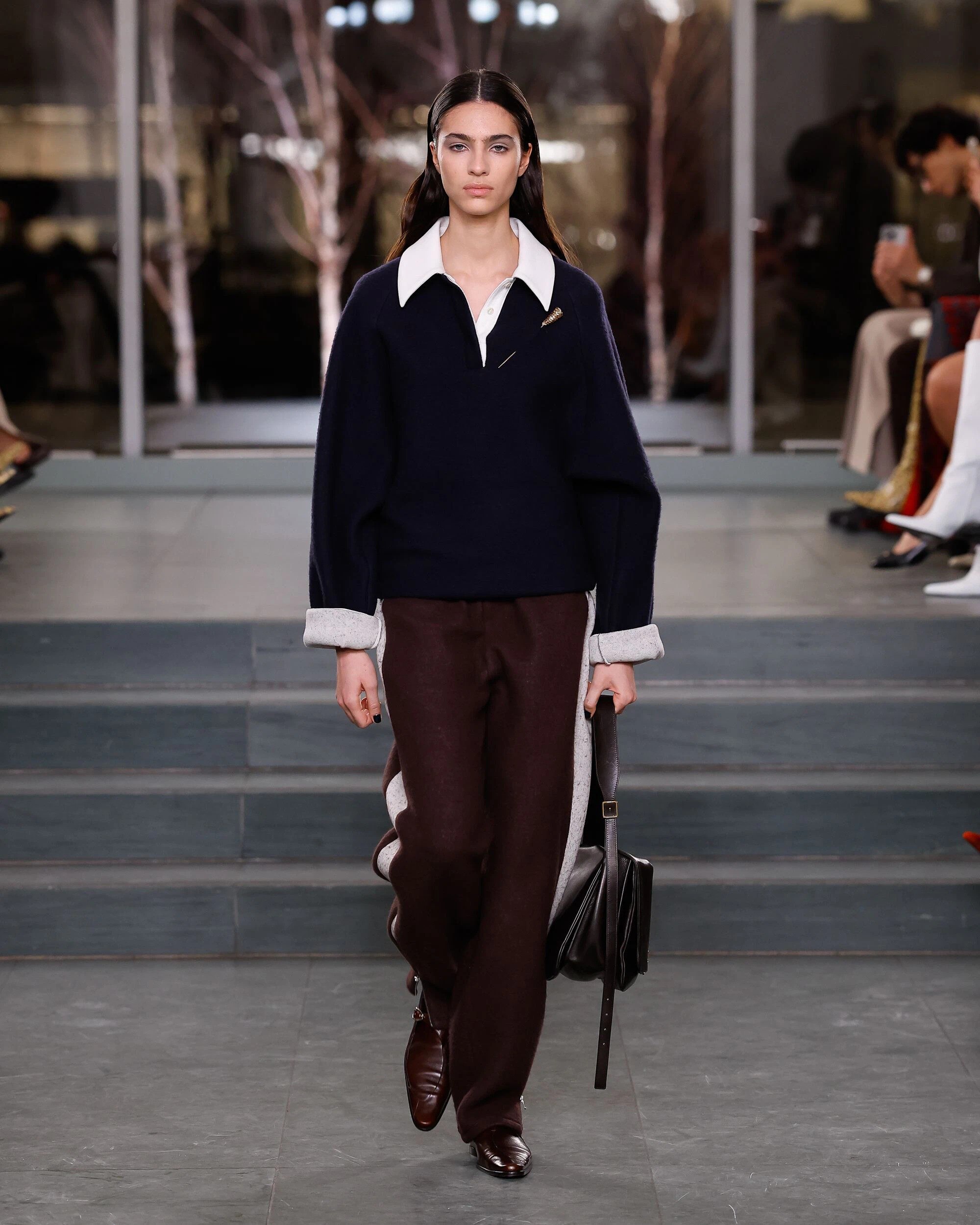 Tory Burch’s Fall 2025 collection showcased her remarkable ability to reinvent heritage fashion with a fresh take on American sportswear. Hosted at the Museum of Modern Art, the collection balanced structured and fluid designs, featuring layered cardigan twin sets, oversized striped shirts, and tailored wool jackets with exaggerated silhouettes. Accessories boasted statement cuffs and chain-linked rings inspired by vintage designs. Burch’s collection confirmed that classic American style was constantly evolving, remaining sophisticated and modern