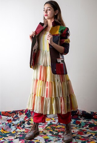 Doodlage is a blend of exclusive and sustainable high street fashion. Established in 2012 by Kriti Tula, it has put upcycling and patchwork at the heart of its designs. The brand creates limited edition collections from waste fabrics sourced from factories in Delhi. Aimed at being a zero-waste brand, Doodlage uses leftover materials to create accessories, furnishing products, and packaging. Their range includes patchwork in dresses, shirts, trench coats, jackets, pants and more, including menswear. The patchwork collection is not limited to clothes, the label also has a range of wallets, tote bags and journals.