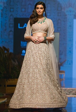 Known for beautiful prints and intricate embroider, Ridhi Mehra once again stole a million hearts with her latest collection ‘An ode to Heirlooms‘. Exploring her roots and reflecting on her family’s cultural duality, she staged a personal yet extremely powerful presentation at Lakme Fashion Week W/F ’19. While uniquely showcasing the rich culture and beautiful aesthetics of India, the collection has an interesting contemporary twist to it that seamlessly lends the signature Ridhi Mehra touch. Diana Penty played Ridhi Mehra’s Muse and walked down the runway in a gorgeous ivory lehenga that was intricately embroidered and embellished with sequins.