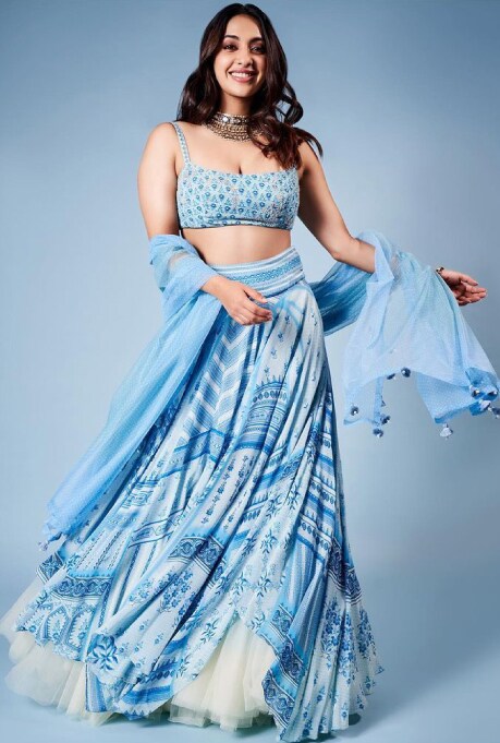 Make a splash at summertime nuptials in one of the most popular shades for bridesmaids in the West with an Indian spin! For her sister’s ceremony, Akansha Ranjan Kapoor slipped into a serene blue Lehenga crafted by Anita Dongre. Adorned with subtle cascading prints in similar hues, the asymmetrical select is perfect for twirling around in sunshine-filled daytime weddings. With a fuss-free printed ensemble like this, you’ll be able to master your BFF duties without compromising on style. Take notes from the actor and complete your look with a statement choker necklace and earrings to match.