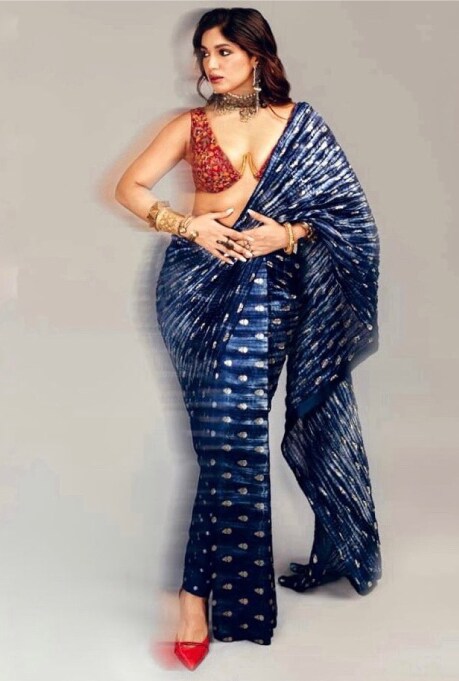 If you’re a bridesmaid who’s not afraid to take the risqué route, then this look is for you! Bhumi Pednekar’s plunging bralette teamed with Qbik’s bandhani Pant Saree is perfect for bridesmaids who are looking to stir up a storm with their sartorial choices. Wearing a contemporary iteration of the classic drape, Pednekar amped up her look by going all out on accessories. Teamed with Kadas, Bangles, Rings and an attention-grabbing choker neckpiece, Bhumi Pednekar’s attire is surely bookmark-worthy for all bridesmaids-to-be!