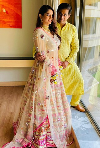 For her intimate Haldi ceremony, she chose a radiant & striking Abhinav Mishra lehenga adorned with mirror work. She was going for an elegant and classic look, and felt that an outfit from the designer would add a jolly element to the ceremony. The couple decided to turn it into a lively dancing event to make up for not being able to host a cocktail party or Sangeet function.