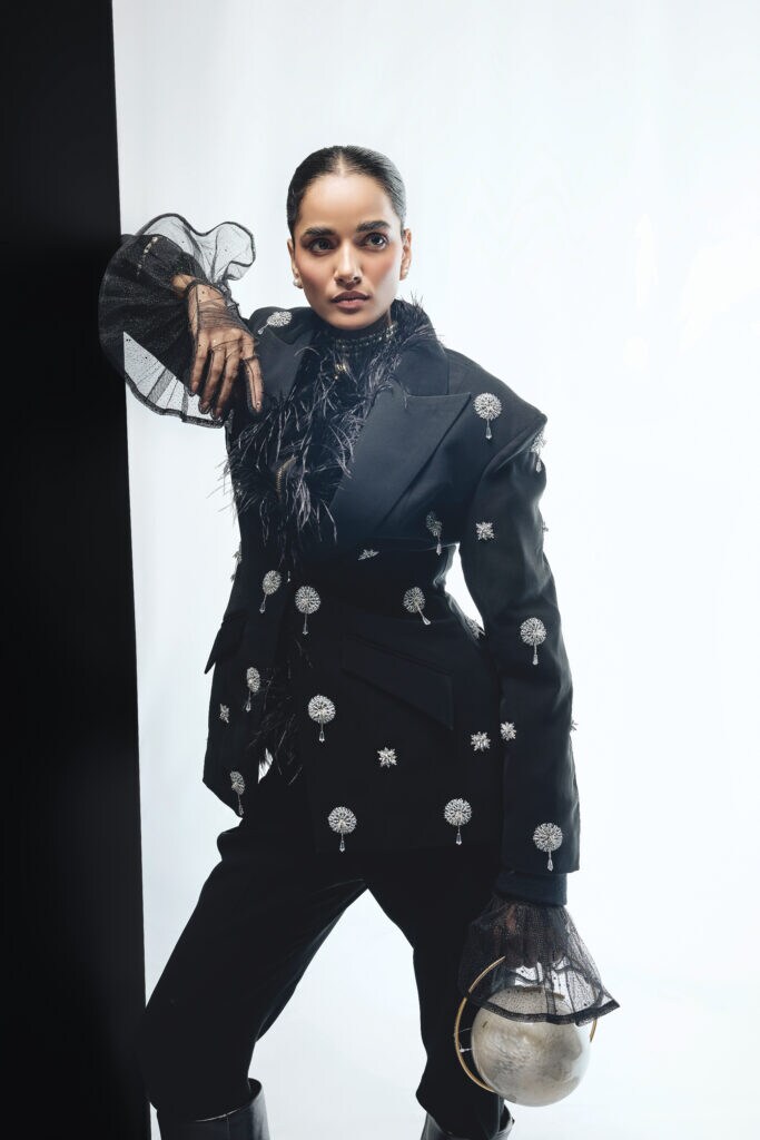 On Shalini: Varun Bahl (fur jacket), CILVR (blazer and trouser), Baala (jewellery), Alor Bags (bag), Oroh (boots).