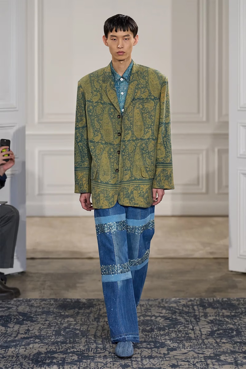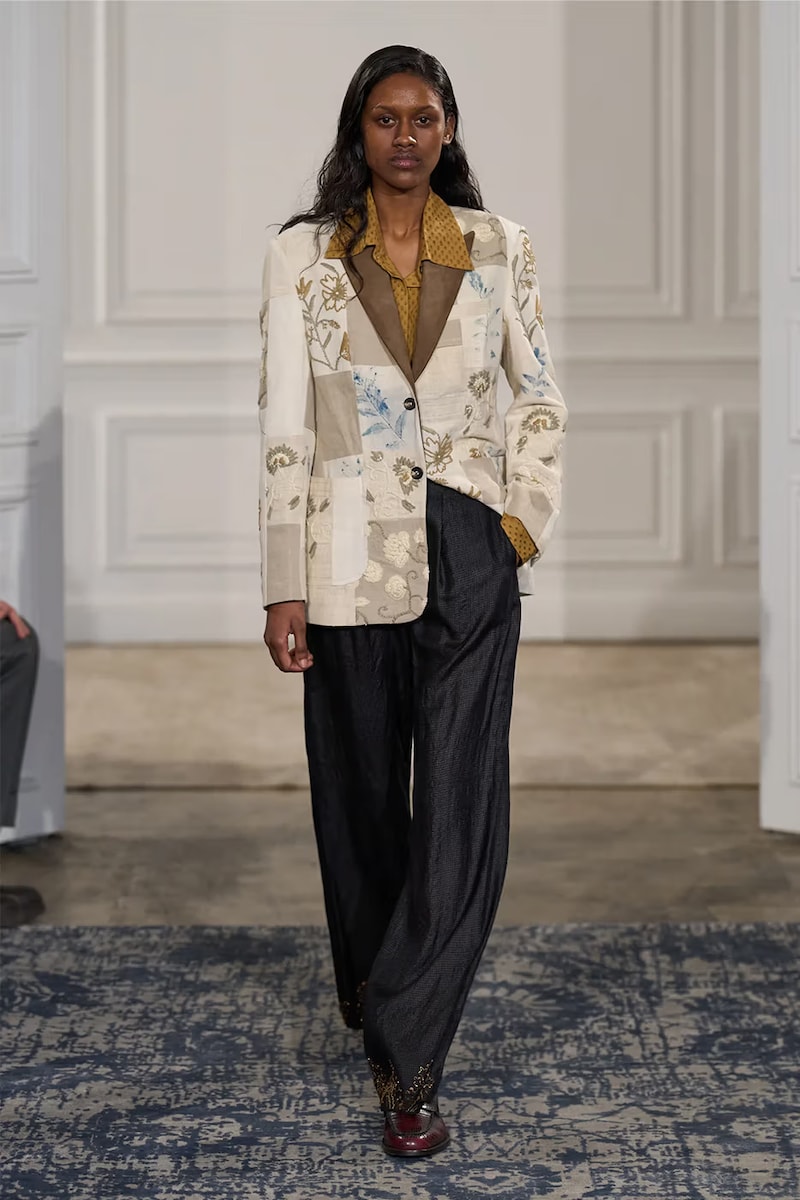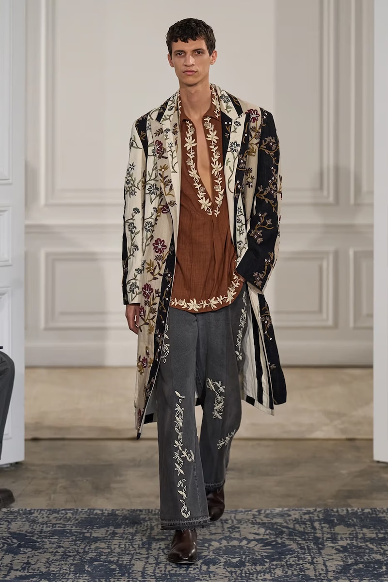 Earthy hues and timeless neutrals anchored the collection. From kantha-embroidered tuxedo jackets and barn coats traced with delicate floral vines to oversized pistachio linen suits, the silhouettes felt both nostalgic and refreshingly modern. Hand-embroidered paisley motifs, Palampore patchwork overcoats, block-printed blazers and flight jackets, and indigo-dyed patchwork trousers formed the tactile backbone of the presentation – each piece echoing a reverence for craft that is synonymous with the brand.