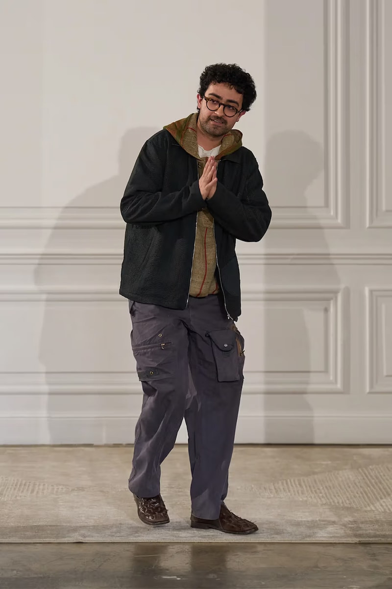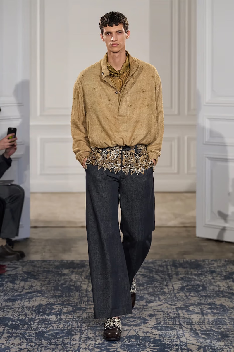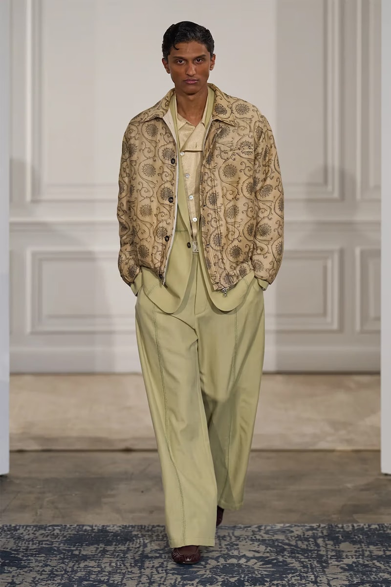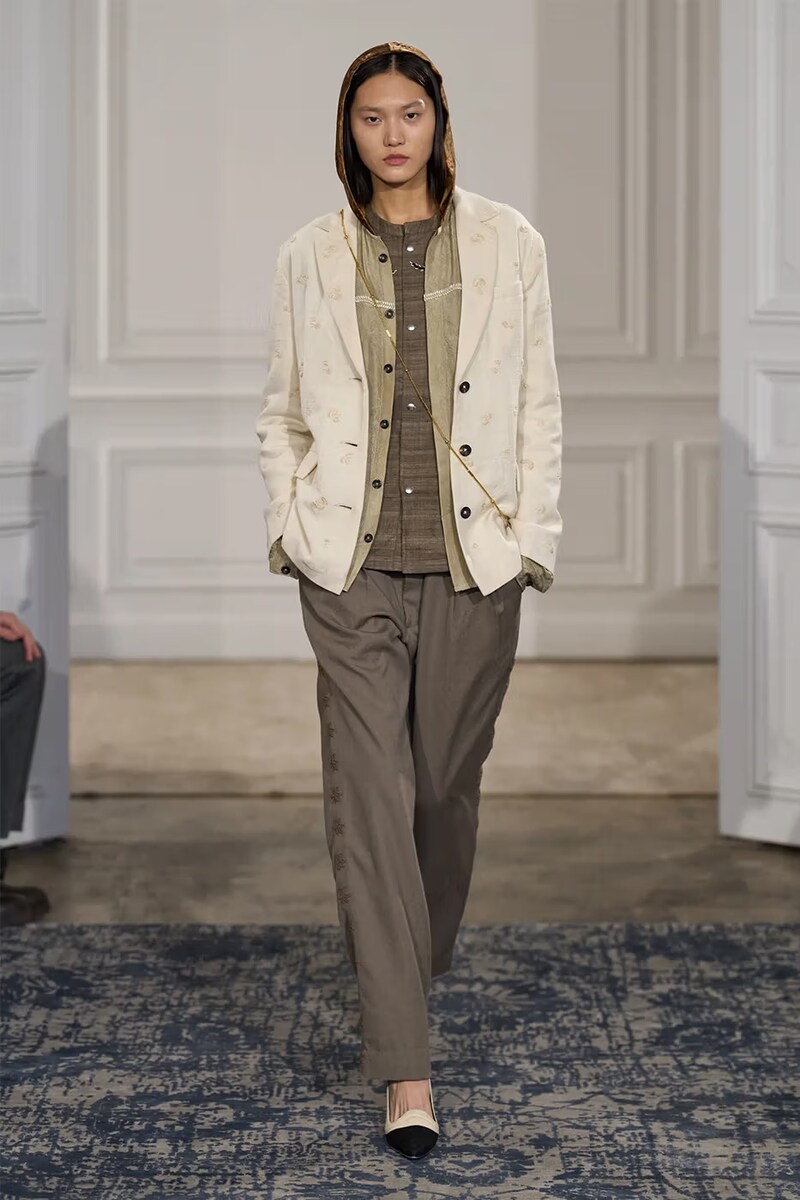 Earthy hues and timeless neutrals anchored the collection. From kantha-embroidered tuxedo jackets and barn coats traced with delicate floral vines to oversized pistachio linen suits, the silhouettes felt both nostalgic and refreshingly modern. Hand-embroidered paisley motifs, Palampore patchwork overcoats, block-printed blazers and flight jackets, and indigo-dyed patchwork trousers formed the tactile backbone of the presentation – each piece echoing a reverence for craft that is synonymous with the brand.