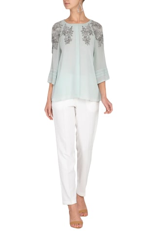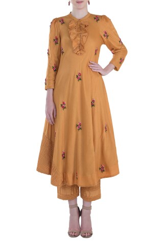 You’ll easily give any dress amiss to adorn this divinely comfy and preppy kurta set on a work day, The dainty flower accents and the cigarette style pants are equal parts stylish and purposeful for a drizzly day!