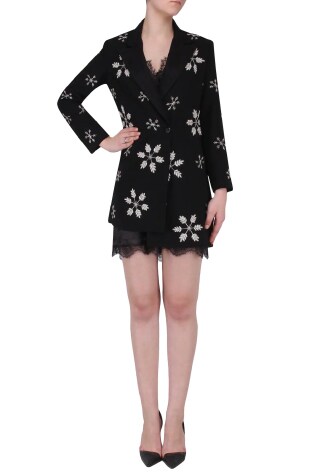 Stepping out for a cocktail party and dreaded about a downpour? Don’t let anything dull your sparkle as you don this black slip dress with a layer of an embroidered blazer. Chilly breeze or drizzles, this dress is a stylish antidote to any climatic dismay.