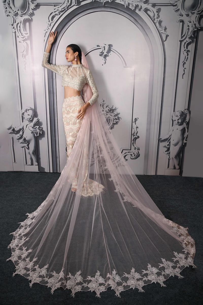Indian designers are reimagining the veil in strikingly diverse ways. Think Sabyasachi’s intricately embroidered gossamer veils paired with sarees, and Tarun Tahiliani’s fusion of traditional zardozi with delicate crystal work – each interpretation brings something new. Gaurav Gupta sculpts his veils like wind-caught waves, and Aisha Rao turns hers playful – adorned with appliqué and unexpected textures, while Roseroom by Isha Jajodiaʼs veils are impeccably designed to lend silhouettes a delicate softness, adding depth and dimension to the look.