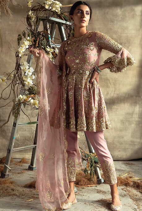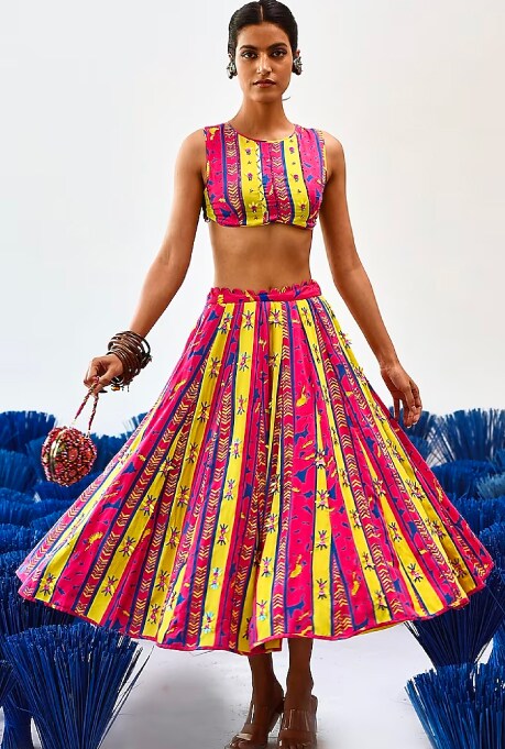When planning a monsoon wedding wardrobe, shorter hemlines are always a failsafe option, as they will elevate your wedding glam look without being at risk of getting spoilt. The printed lehenga set by Baise Gaba features a vibrant play of colours and prints with the perfect hemline length. Style it with high heels and chunky silver jewellery for a whimsical bohemian look. While this fit has a minimal aesthetic, the rose gold short Anarkali set by Rachit Khanna is great for amping up the glam quotient. Make a carefree statement in this outfit, as the short tunic and tapered pants will eliminate the hazard of getting smeared with mud.