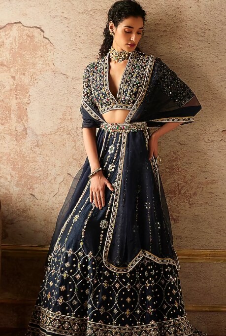 If you are fond of heavy embroideries and regal fabrics, no weather should stop you from donning your dream outfit! However, if you plan on having an outdoor wedding, opting for deep hues will minimize the chances of probable mishaps caused due to mud splashes. The hot pink lehenga by Rachit Khanna is the perfect bridal ensemble for the main wedding day. The dabka work on this lehenga will ensure that the embroidery doesn’t blacken due to moisture, unlike heavy zardosi or gota-patti work. For a glam-filled cocktail party, go for a darker shade like the navy lehenga set by Ridhi Mehra. Featuring regal bead embroidery, this medium-heavy piece is perfect for dancing away the night with maximum glitz and comfort.