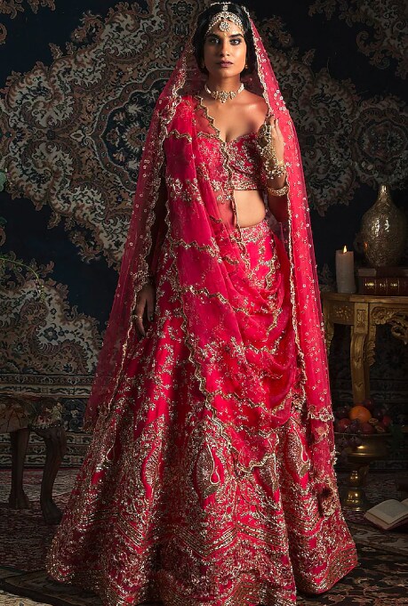A glamorous and fun-filled sangeet or cocktail party deserves a spotlight-worthy lehenga like the one by Mehak Murpana. The enchanting floral print on the rich-hued base will make you stand out, while the gold embroidered bustier will add gravity to this look.