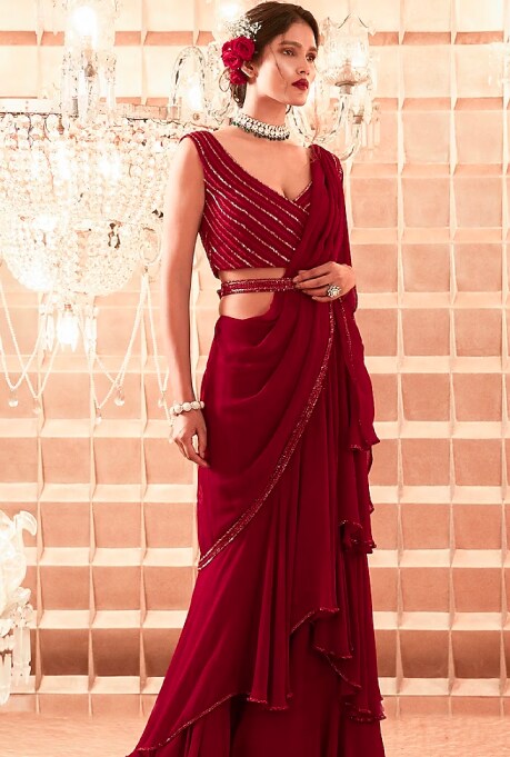 No matter how many modern and innovative creations you might browse through, the timeless charm of a saree is indispensable. However, handling a six-yard drape amidst rain-soaked surroundings can be challenging. When looking for a saree to don at monsoon weddings, a pre-draped saree is an unbeatable choice! For a daytime event, opt for a pastel shade like the teal pre-draped jacket saree set by Ridhima Bhasin. The dreamy hue and dazzling embroidery of this ensemble are best suited for making an ethereal fashion statement under gloomy skies. If you are not up to taking the risk of wearing pastels, the oxblood ruffled saree set by Charu & Vasundhara will put you in the spotlight for a nighttime cocktail or reception party! Style it with Kundan jewellery to complete the look and create a show-stopping fashion statement.