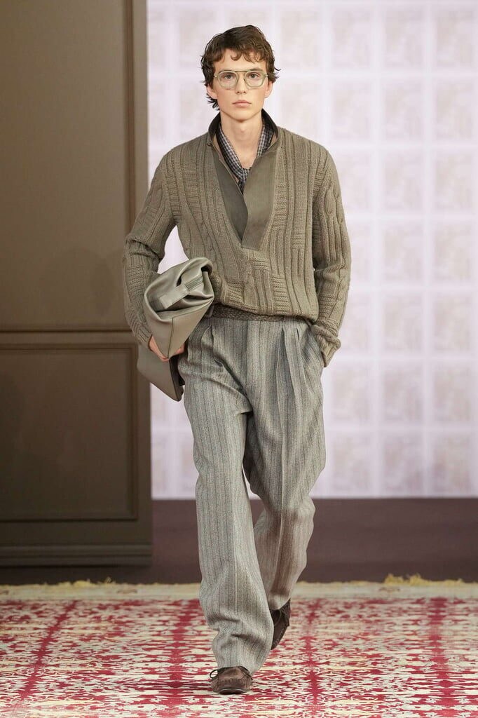 Returning to Milan after last season’s Dubai sojourn, this homecoming show refocused attention on the importance of home – and the closet in particular – as a space of preservation. In Zegna’s wardrobe, past, present, and future coexist. Instinct and intuition were visible throughout the designs, as models strutted down the runway in looks defined by thoughtful cuts, layered textures, and considered patterns.